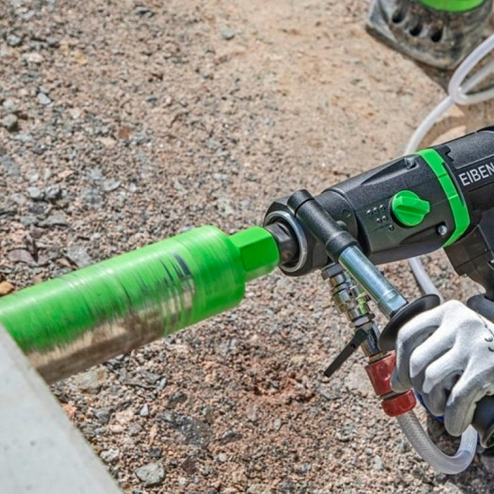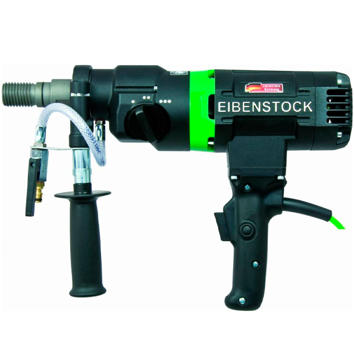 Дрель алмазного сверления EIBENSTOCK PLD 182.1 NT - позволяет выполнять отверстия в натуральном камне, кирпичной кладке, железобетоне, асфальте и других твердых материалах. Максимальный диаметр бурения 12-182 мм во влажном бетоне, 12-202 мм в сухой кирпичной кладке. Водяное охлаждение коронки значительно продлевает срок ее эксплуатации и уменьшает образование пыли во время работы. Оборудование имеет эргономичную рукоятку с кнопкой большого размера, что способствует удобному удержанию и легкому нажатию. Мощный двигатель мощностью 2300 Вт с высоким запасом мощности и длительным сроком службы, способный к непрерывной работе под давлением. Электронный - плавный пуск, контроль температуры и отключение перегрузки по току, индикация перегрузки. 3-ступенчатая коробка передач с масляной ванной - для оптимальной смазки во всех рабочих положениях благодаря специально разработанному масляному насосу и оптимальному регулируемому крутящему моменту-скорости-соотношению для всех диаметров.